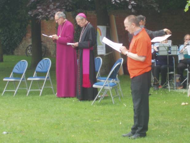 The service featured a brace of bishops. In purple we have the Anglican Bishop of Ramsbury whilst in mostly black we have the Roman Catholic Bishop of Clifton. In orange we have a local believer who seemed to be serving as the warm up act for the important chaps who followed.